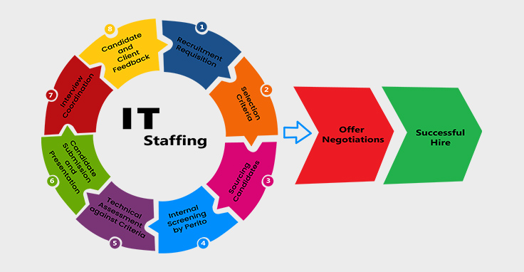 The IT staffing process typically involves identifying the client’s requirements, sourcing and screening candidates, conducting interviews, and facilitating the hiring process.